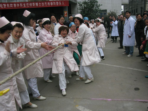 “天使”拔河 健身強體 發(fā)布時間:2009年3月10日 預(yù)覽:4072次 本報訊 為了以健康的體魄更好地服務(wù)患者,我院通過全員健康體檢及舉辦登山、球賽等健身活動,既提高了醫(yī)務(wù)人員身體素質(zhì),又促進了團結(jié)協(xié)作精神。圖為3月10日拔河比賽的情景。(鄒建軍攝)