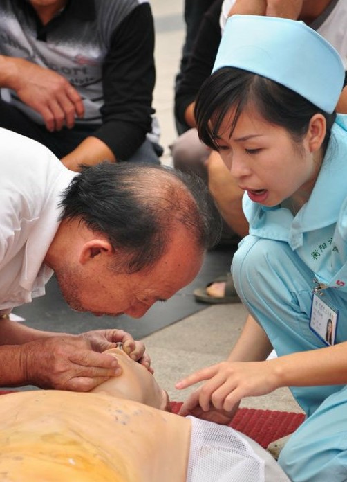 市中心醫(yī)院舉行“世界急救日”宣教活動 發(fā)布時間:2010年9月14日 預(yù)覽:3591次 市中心醫(yī)院舉行“世界急救日”宣教活動 9月11日是“世界急救日”。為提高公眾的自救互救意識,讓更多的人士掌握急救技巧,在突發(fā)事件現(xiàn)場挽救生命和降低傷害程度。衡陽市中心醫(yī)院在這一天開展了“知識守護(hù)生命,急救在我身邊”主題宣教活動,他們組織醫(yī)務(wù)人員在人流匯集區(qū)域教導(dǎo)廣大市民掌握急救技能、發(fā)放《日常急救知識宣傳手冊》并提供現(xiàn)場救護(hù)知識咨詢。圖為該院急診科一名護(hù)士正在向市民傳授正確的人工呼吸方法。(澗峻)