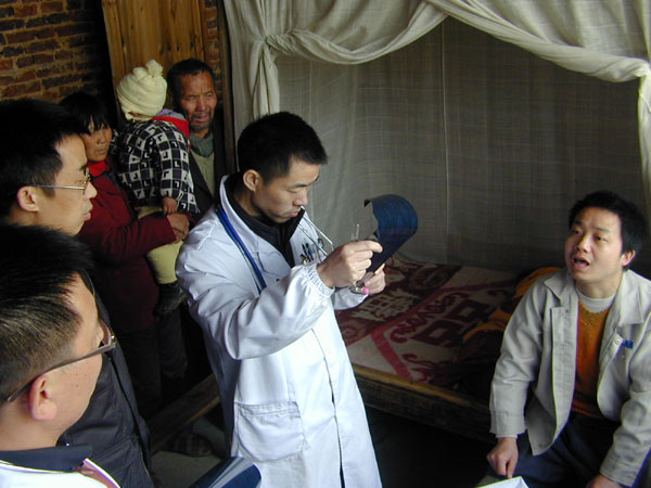 由于村民之間相距遙遠(yuǎn),義診設(shè)點(diǎn)難以照顧到方方面面,醫(yī)務(wù)人員對(duì)于不能前來的重病人和年老行走不便的病人,他們向駐點(diǎn)的工作人員了解情況后,還主動(dòng)上門服務(wù),祁東縣太和塘鎮(zhèn)向陽村一位28歲的小伙子匡旭,5歲喪母,10年前在岳陽中南大學(xué)計(jì)算機(jī)專業(yè)畢業(yè)后南下廣東打工,與人發(fā)生糾紛,被打腦袋,當(dāng)時(shí)限于家庭條件,沒有及時(shí)治療,造成腦痿縮加重,行動(dòng)時(shí)全身抽搐,生活難能自理,其父親勞動(dòng)能力欠佳,爺爺僅靠微薄的退休工資支持孫子,前不久設(shè)法讓孫子到省城醫(yī)院進(jìn)行了檢查,這次義診的唐九陽博士和神經(jīng)內(nèi)科鞏學(xué)磊專家反復(fù)查看了所拍的CT、磁共振片子懷疑患有原發(fā)性大腦皮層硬化癥,對(duì)他的服藥情況進(jìn)行了分析,離開時(shí)對(duì)他的康復(fù)治療提出了較好的建議。