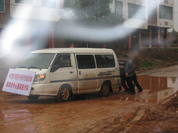 飯后接著去第二個(gè)目的地黃土鋪壽嶺村,這里是狹長地帶,路途遙遠(yuǎn),山路崎嶇,由于大部分路段改修國道,原有的道路雨后路面凹凸不平,積水的路面難料深淺,車行進(jìn)中不時(shí)底盤碰出響聲,有時(shí)還深陷泥里難以開出,從去到返回,兩次排汽筒進(jìn)水熄火,隊(duì)員們只好都下來推車,更顧不上一身泥水,由于行走在轉(zhuǎn)彎抹角、坑洼不平的路上,車內(nèi)人貨混裝,人員相對(duì)擁擠,有的隊(duì)員淋雨后頭暈?zāi)X脹,兩位隨行的護(hù)士嘔吐不止,當(dāng)看到村民從四面八方趕來的場景,隊(duì)員們克服各種困難馬上就投于到義診,開始村民還不能理解,以為只是來走過場,有個(gè)別人還有牢騷,當(dāng)看到醫(yī)務(wù)人員誠心盡力為村民看病后,還免費(fèi)發(fā)藥給他們,他們才釋言贊揚(yáng):“我們能得到城里大醫(yī)院專家治療實(shí)在難得”。