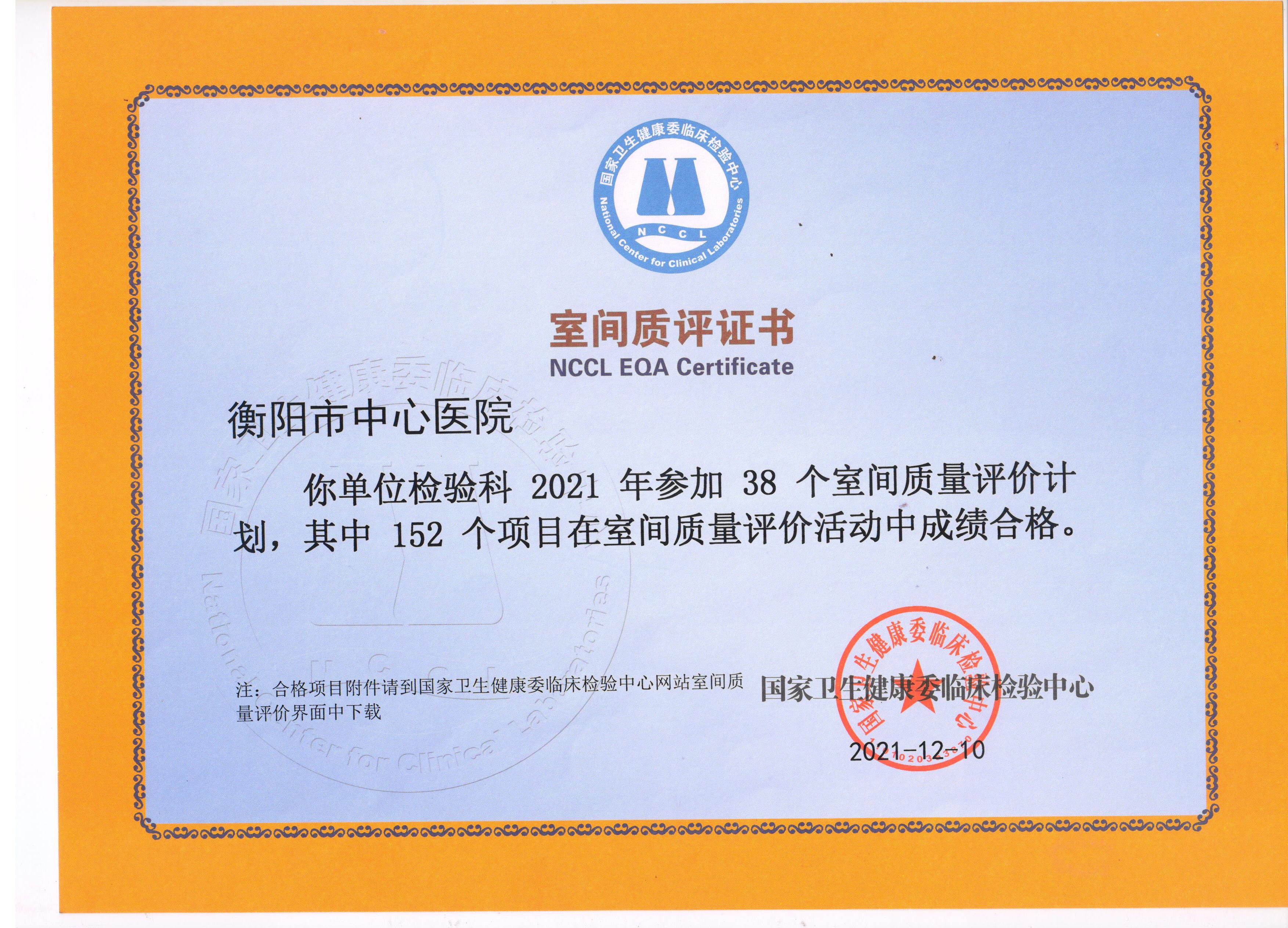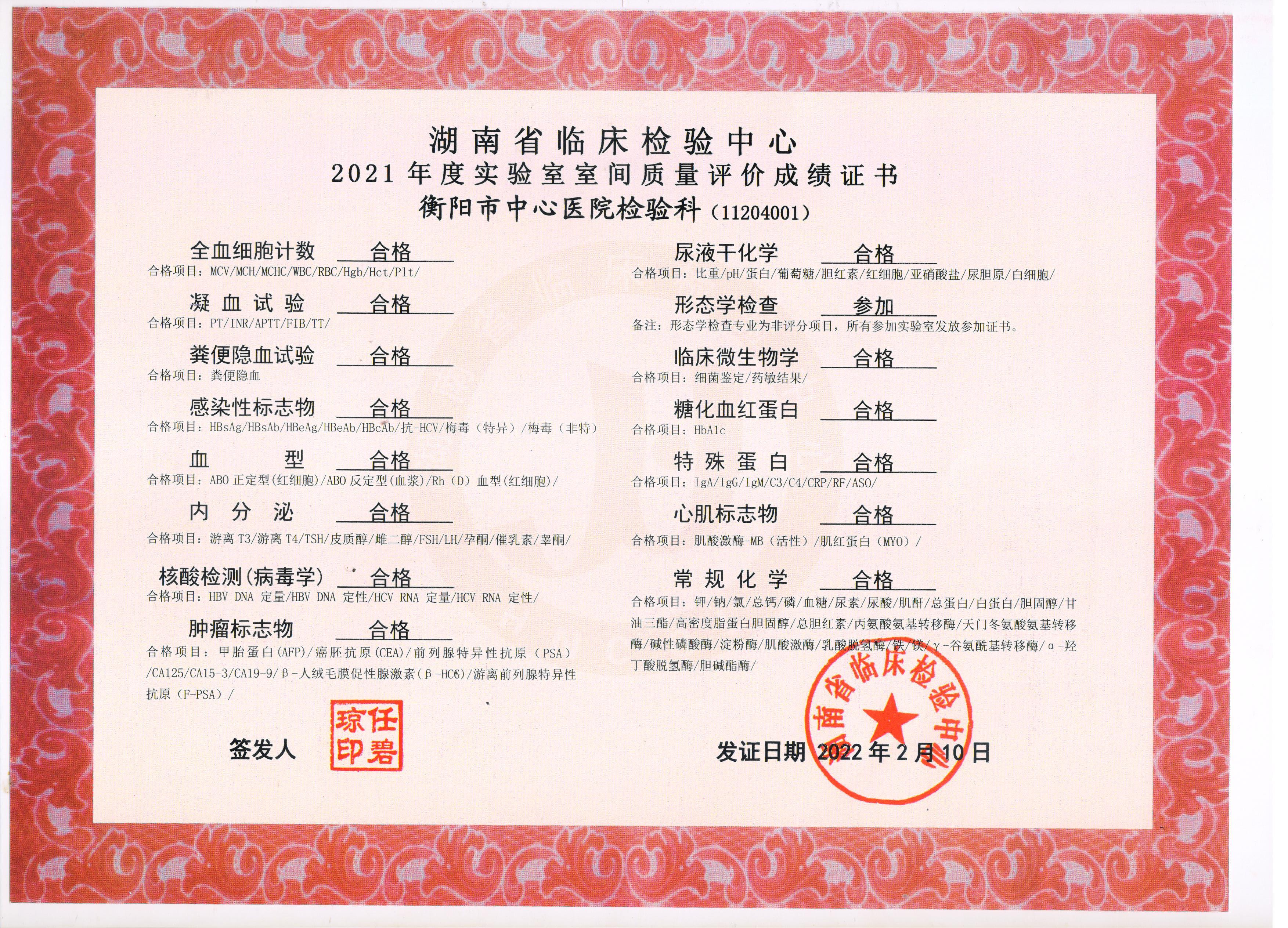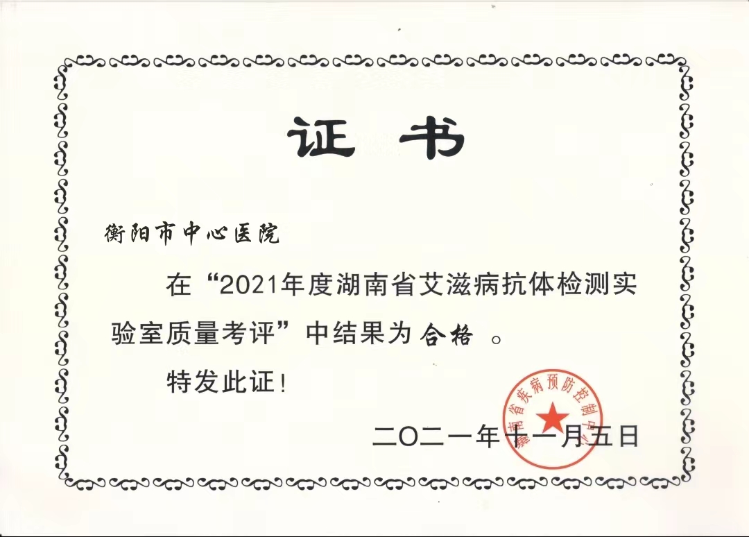 檢驗科室間質(zhì)評證書(2021-2022年度) 發(fā)布時間:2022年09月13日 18:03:22 預(yù)覽:5372次 2021年檢驗科室間質(zhì)評項目結(jié)果明細(xì)(2021-2022年度).pdf2021檢驗科湖南省艾滋室間質(zhì)評證書(2021-2022年度).jpg2021年檢驗科室間質(zhì)評證書(2021-2022年度).jpg2021年檢驗科湖南省室間質(zhì)評證書項目(2021-2022年度.jpg