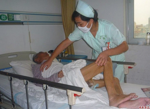 讓王先生更感動的是,曾春秀和呼吸內(nèi)科全體醫(yī)護(hù)人員將近兩個月來對其父親王爺爺?shù)恼樟?。他說,特別要感謝曾護(hù)士,她不嫌臟不怕累的精神值得表揚(yáng)。王爺爺同時患有左側(cè)股骨粉碎性骨折,醫(yī)院采取骨牽引治療方法在他的腿部打入鋼釘,每次護(hù)理的時候曾春秀都小心翼翼,盡量減輕骨折創(chuàng)口的疼痛。由于長期臥床王爺爺又患上3級褥瘡,剛轉(zhuǎn)入呼吸內(nèi)科的時候,他的臀部已經(jīng)有了一個拳頭大小的褥瘡開始惡化,曾春秀堅(jiān)持每天兩次給病人擦洗臀部并換藥,每個小時給他翻身一次,經(jīng)過10多天的精心護(hù)理,王爺爺?shù)娜殳彵阃耆狭恕?/p>