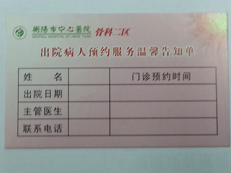 此次,骨科中心二區(qū)又根據(jù)醫(yī)院的隨訪制度和科內(nèi)實際情況,設計出臺了“出院病人預約服務溫馨告知單”。它設計溫馨,內(nèi)容簡單明了,醫(yī)生姓名,聯(lián)系電話,及預約時間都一目了然,并且名片式卡片易于隨身攜帶,患者隨時都可與醫(yī)生主動聯(lián)系,不會忘記自己復診時間, 如此堅持下去, 一來患者感到尊貴服務, 增加醫(yī)患溝通, 二來促進患者康復,降低醫(yī)療糾紛,再者對醫(yī)院科室也是一種極好的文化宣傳, 有利于穩(wěn)定和擴大病源,增加醫(yī)院科室影響力,有利于做大做強。
