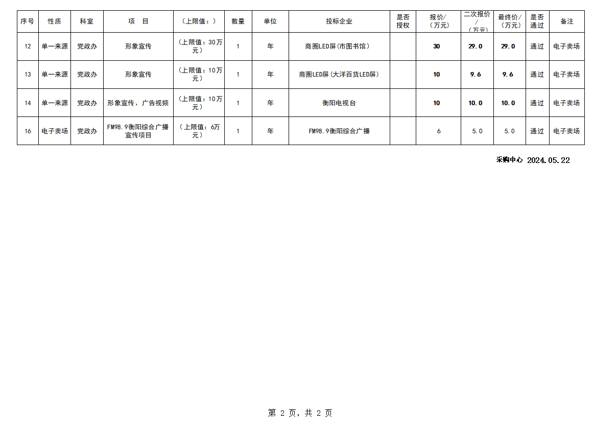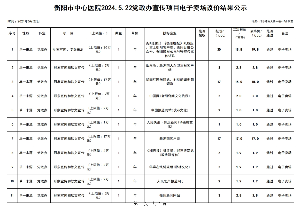 衡陽市中心醫(yī)院2024.5.22黨政辦宣傳項(xiàng)目電子賣場議價(jià)結(jié)果公示 發(fā)布時(shí)間:2024年06月07日 15:35:13 預(yù)覽:5823次
