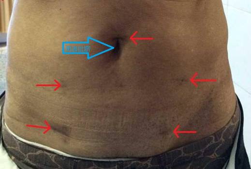 據(jù)譚曙光主任介紹,隨著微創(chuàng)外科和功能外科的興起,盡可能減少創(chuàng)傷并保留機體的功能已成為外科醫(yī)生追求的更高目標。在諸多的微創(chuàng)技術(shù)中,經(jīng)自然腔道內(nèi)鏡手術(shù)(NOTES)的發(fā)展是備受關(guān)注的熱點之一。在腹腔鏡直腸癌微創(chuàng)手術(shù)中,充分利用自然腔道取出標本并完成消化道重建,此類術(shù)式除腹部五個鑰匙孔大小的操作孔外(見圖紅色箭頭所示),無其他切口,縮短了手術(shù)時間,更加符合功能外科的理念,不僅極大減輕了患者的術(shù)后疼痛,而且可以得到令人滿意的美容效果。另外,此類手術(shù)很大程度地減少了術(shù)后切口腫瘤種植、切口疼痛、切口感染、切口疝等并發(fā)癥的發(fā)生,也減少了傳統(tǒng)腹腔鏡手術(shù)中腹腔臟器在空氣中的暴露,引起術(shù)后腸粘連、腸梗阻的幾率,縮短了患者的康復周期。