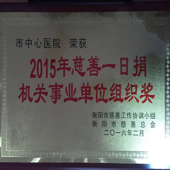 2016年3月3日晚上,第三屆“衡陽慈善獎”暨2015年“慈善一日捐”總結大會上,衡陽市中心醫(yī)院被授予第三屆“衡陽慈善一日捐”機關事業(yè)單位組織獎。