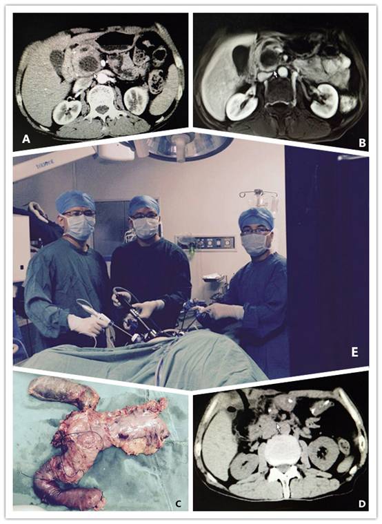 我院成功開展首例腹腔鏡輔助胰十二指腸切除術(shù) 發(fā)布時間:2016年7月6日 預(yù)覽:2269次 近日,胃腸外科成功開展了我院首例腹腔鏡輔助胰十二指腸切除術(shù)。 今年6月,我院胃腸外科收治了一名男性患者,因上腹部疼痛3年入院治療。術(shù)前影像學檢查腹部增強CT(如圖A)、腹部MRI(如圖B)。由于微創(chuàng)技術(shù)的突飛猛進,加上近幾年來積累的豐富經(jīng)驗,譚曙光主任帶領(lǐng)的胃腸外科微創(chuàng)團隊,果斷決定采用腹腔鏡輔助技術(shù)來完成此例手術(shù)。從建立氣腹、探查、游離顯露、小切口開腹吻合至關(guān)腹,總共歷時約6小時,完整地切除標本(如圖C),術(shù)后患者恢復(fù)順利,病理結(jié)果為胰腺假性囊腫,復(fù)查腹部CT(如圖D),術(shù)后14天患者順利出院。 胰十二指腸切除術(shù)由于其解剖復(fù)雜、毗鄰重要血管,為普通外科疑難手術(shù)之一,也是微創(chuàng)外科領(lǐng)域最難攻克的堡壘。微創(chuàng)胰十二指腸切除術(shù),由于胰頭及壺腹部腫瘤部位解剖復(fù)雜,周圍有重要血管且血供豐富,手術(shù)涉及多個吻合口的重建,具有手術(shù)風險大、技術(shù)難度高等特點,是最具挑戰(zhàn)性的手術(shù),同時也是備受爭議的手術(shù)。開展此類手術(shù),外科醫(yī)生精湛的手術(shù)操作技巧、團隊配合是手術(shù)成功的關(guān)鍵。胃腸外科憑借譚曙光主任多年的手術(shù)經(jīng)驗、高超的腔鏡應(yīng)用技術(shù),以及一支優(yōu)秀的腔鏡團隊(如圖E),順利出色地完成了我院首例腹腔鏡輔助胰十二指腸切除手術(shù)。 目前,我院胃腸外科開展的腹腔鏡下胃腸道腫瘤手術(shù)的例數(shù)及其技術(shù)在湘南地區(qū)處于領(lǐng)先地位。該手術(shù)的成功開展,不僅體現(xiàn)了我院胃腸外科的整體實力,也標志著我院在微創(chuàng)外科技術(shù)層面又邁進了一大步。 (賀賽奇)