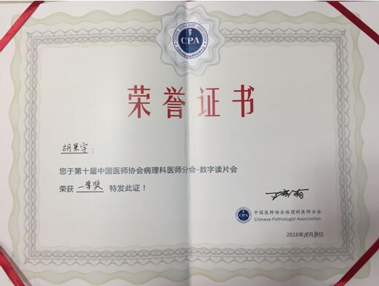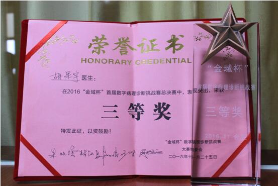 胡果宇榮獲第十屆中國病理醫(yī)師年會數(shù)字讀片比賽一等獎 發(fā)布時間:2016年12月1日 預(yù)覽:2628次 近日,第十屆中國病理醫(yī)師年會上傳來喜訊,我院病理科副主任胡果宇榮獲中國醫(yī)師協(xié)會病理醫(yī)師分會數(shù)字讀片會比賽一等獎。2016“金域杯”首屆數(shù)字病理診斷挑戰(zhàn)賽上,胡果宇又以華中賽區(qū)第一名的好成績?nèi)雵珖鶑姟?1月25日,經(jīng)過激烈角逐,胡果宇最終在總決賽上榮獲了三等獎。 據(jù)悉,胡果宇副主任醫(yī)師從事臨床病理診斷近十年,具有扎實的基本功和敏銳的觀察力,主要在組織學(xué)、細胞學(xué)病理尤其是腫瘤病理的診斷上頗有所長。 (王穎超)