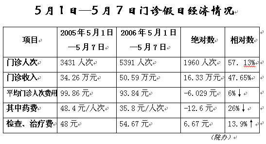 “五一”期間,全院門診病人5405人次,比去年同期增加1960人次,增幅達(dá)57%;檢驗(yàn)3264人次,去年1300人次;照片714人次,CT 285人次,去年181人次;磁共振223人次;心電圖276人次,去年170人次;心臟彩超80人次:胃鏡198人次,去年102次;B超884人次,去年306人次;誘發(fā)電位15人次;門診總收入50.6萬元,比去年同期增加16.3萬元,增幅達(dá)47.6%。新收住院人數(shù)250人,比去年同期增加51人,增幅達(dá)26%。“五一”后,住院病人每天遞增,昨天已達(dá)到600人。