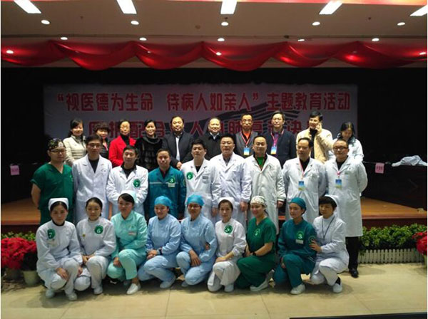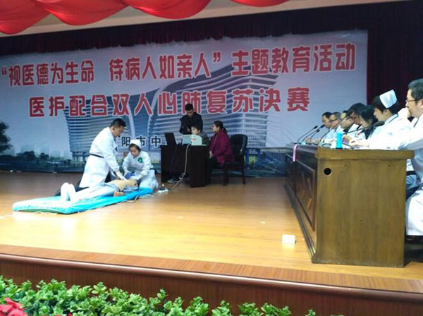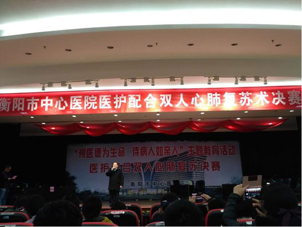 醫(yī)生護(hù)士配合,比救命技能 發(fā)布時(shí)間:2017年12月2日 預(yù)覽:2193次 “前方有人倒地,環(huán)境安全。先生,先生,你怎么啦?”,“意識(shí)喪失,無(wú)心跳呼吸,快來(lái)人吶,有人暈倒,準(zhǔn)備搶救……”這是11月30日下午,衡陽(yáng)市中心醫(yī)院舉行醫(yī)護(hù)配合雙人心肺復(fù)蘇術(shù)決賽場(chǎng)景。參賽者一邊判斷周圍環(huán)境是否安全,一邊看表記錄搶救開始時(shí)間,按照心肺復(fù)蘇流程有條不紊地?fù)尵?,伴隨著一幕幕驚心動(dòng)魄的搶救畫面,選手們很快進(jìn)入急救狀態(tài),他們?cè)谥悄苣M人面前判斷與準(zhǔn)備、開放氣道、胸處心臟按壓、人工呼吸、檢查評(píng)估……整個(gè)比賽過(guò)程緊張有序,參賽人員穿戴整潔、精神飽滿、口齒清晰、動(dòng)作嫻熟、干凈利落、配合默契。 本次進(jìn)入決賽的科室有骨科二區(qū)、眼科、心內(nèi)科、急診科、ICU、麻醉手術(shù)室、120急救中心共七個(gè)科室。每個(gè)科室選拔出1對(duì)選手代表本科室參賽,每對(duì)選手由1名醫(yī)生、1名護(hù)士組成。劉小平副院長(zhǎng)、李珍發(fā)副院長(zhǎng)、周艷玉主任、龍偉副科長(zhǎng)、劉燕妮主任醫(yī)師、桂若虎主任、鐘三寶主任擔(dān)任比賽評(píng)委。黨委書記肖友儒鼓勵(lì)參賽選手賽出水平,賽出精神風(fēng)貌。院領(lǐng)導(dǎo)資小龍、蔡春香及300多名醫(yī)護(hù)人員觀摩比賽。最終,ICU獲得一等獎(jiǎng),心內(nèi)科獲得二等獎(jiǎng)、120急救中心獲得三等獎(jiǎng)。 本次比賽是衡陽(yáng)市中心醫(yī)院“視醫(yī)德為生命,待病人如親人”主題教育活動(dòng)的重要內(nèi)容,為進(jìn)一步提高醫(yī)療質(zhì)量,確保醫(yī)療安全,激發(fā)廣大醫(yī)護(hù)人員基本技能大練兵及技術(shù)大比武熱潮而舉辦的活動(dòng)。肖友儒書記指出,通過(guò)為期8個(gè)月的“視醫(yī)德為生命、待病人如親人”主題教育活動(dòng),衡陽(yáng)市中心醫(yī)院積極實(shí)施醫(yī)德提升工程,改善服務(wù)態(tài)度,優(yōu)化服務(wù)質(zhì)量,構(gòu)建和諧醫(yī)患關(guān)系,全院上下形成了“視醫(yī)德為生命、待病人如親人”的濃厚氛圍,實(shí)現(xiàn)了服務(wù)態(tài)度改善、醫(yī)務(wù)人員素質(zhì)提升、醫(yī)院發(fā)展跨越的總體目標(biāo)。(郭 偉)
