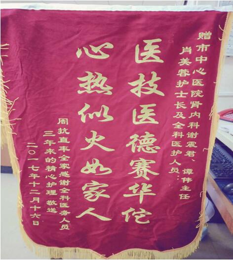 病房里特別的生日會 發(fā)布時間:2017年12月20日 預覽:11011次 通訊員肖美蓉報道:12月16日這天,腎內科50床的病房異常熱鬧,一入深看,是在開一場別開生面的派對會呢。原來這天是50床周抗直爺爺85歲生日,這也是周爺爺在腎內科病房度過的第三個生日。 經(jīng)過這么多年的相處,病房的醫(yī)護人員和周爺爺也像親人一樣了。當?shù)弥軤敔斶^生日的消息,護士長決定要讓老爺子過一個熱鬧的生日,當即訂了蛋糕,醫(yī)護人員一起來到周爺爺?shù)拇睬埃蜕献8?,陪老爺子吹蠟燭許愿。當我們半開玩笑的問爺爺是不是許了個長命百歲的愿望時,老爺子哽咽的說道:“我能過今天的生日,是你們醫(yī)務人員一次又一次把我從死亡線上拉下來的,我活的夠本了,我許愿是希望你們醫(yī)務人員長命百歲,有你們這樣的好人多去救治更多的病人?!甭牭剿@么說大家都很感動,謝主任當即說道:“我們每個醫(yī)務人員對待病人都要像對待自己的親人一樣,讓病人來住院就像是回家一樣,要有高尚的醫(yī)德,真正急病人所急,想病人所想,只有這樣病人才會安心的把治療交付于你?!?BR> 隨后周爺爺家屬為我們送來了錦旗,他兒子指著錦旗上的字說道:“‘醫(yī)技醫(yī)德賽華佗 心熱似火如家人’是我們全家人對你們的心聲,感謝腎內科所有醫(yī)務人員三年來的精心護理。腎內科醫(yī)務人員對待病人的態(tài)度也真正做到了‘視醫(yī)德為生命 待病人如親人’”。