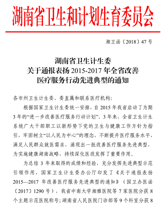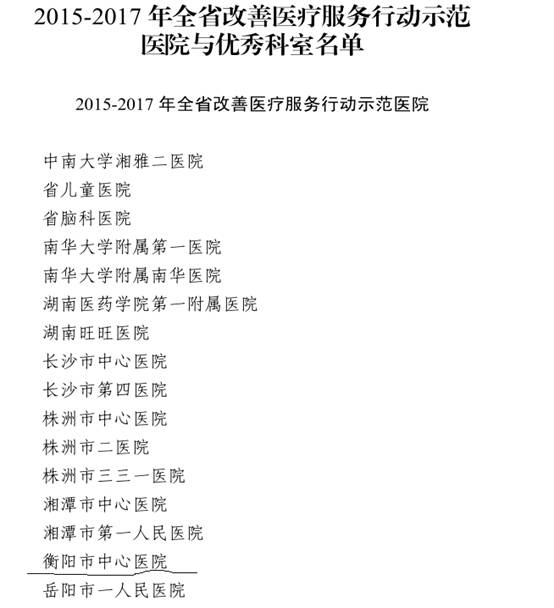 衡陽市中心醫(yī)院榮獲全省改善醫(yī)療服務(wù)行動示范醫(yī)院 發(fā)布時間:2018年4月3日 預(yù)覽:1982次 通訊員吳華報道:近日,湖南省衛(wèi)生與計劃生育委員會發(fā)文,并在2018年全省醫(yī)政工作會議上通報表揚(yáng)2015-2017年全省改善醫(yī)療服務(wù)行動先進(jìn)典型,市中心醫(yī)院榮獲“全省改善醫(yī)療服務(wù)行動示范醫(yī)院”稱號。 2015年在國家衛(wèi)計委的統(tǒng)一安排下,我省啟動為期3年的“進(jìn)一步改善醫(yī)療服務(wù)行動計劃”。3年來,市中心醫(yī)院本著以“患者為中心”的服務(wù)理念,不斷改進(jìn)服務(wù)流程,提高醫(yī)療質(zhì)量,特別是在2017年新領(lǐng)導(dǎo)班子上任之后,在總結(jié)前兩年工作的基礎(chǔ)上,在全院干部職工中開展“視醫(yī)德為生命、待病人如親人”主題教育活動。目前主題教育活動已經(jīng)取得了階段性成效,醫(yī)院服務(wù)意識明顯增強(qiáng),服務(wù)能力明顯提高,干部職工精神面貌明顯好轉(zhuǎn),業(yè)務(wù)發(fā)展態(tài)勢明顯改善。 2018-2020年為我省第二個“進(jìn)一步改善醫(yī)療服務(wù)行動計劃”活動年,市中心醫(yī)院表示,將繼續(xù)以行動計劃為今后的工作重點(diǎn),歸納總結(jié)主題教育活動經(jīng)驗,不斷優(yōu)化醫(yī)院服務(wù)舉措,認(rèn)真落實(shí)醫(yī)療核心制度,狠抓醫(yī)療質(zhì)量和醫(yī)療安全,為群眾提供更為優(yōu)質(zhì)的醫(yī)療服務(wù)與就醫(yī)體驗。