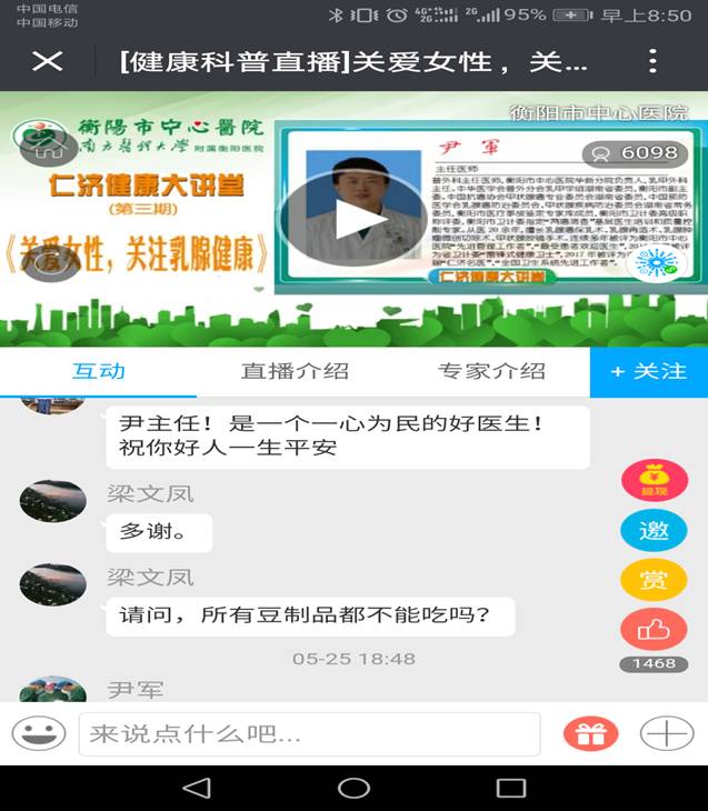 仁濟(jì)健康大講堂在華新院區(qū)開講了 發(fā)布時間:2018年5月29日 預(yù)覽:2610次 通訊員楊柳報道:5月25日,市中心醫(yī)院仁濟(jì)健康大講堂第3期在華新院區(qū)開講。本期大講堂特邀乳甲外科尹軍主任以《關(guān)愛女性健康遠(yuǎn)離乳腺疾病》為題,為患者及家屬講解乳腺癌的預(yù)防和治療。該講堂用圖文并茂的形式,深入淺出地為大家普及醫(yī)療知識,風(fēng)趣的授課方式吸引了100余名市民朋友和患者到場聽課,現(xiàn)場還通過微信進(jìn)行了網(wǎng)絡(luò)直播。 課堂開始從流行病學(xué)角度以通俗易懂的語言和圖片向聽眾介紹了乳腺癌在我國的發(fā)病情況,逐層深入地介紹如何從病因進(jìn)行預(yù)防。隨后,現(xiàn)場指導(dǎo)大家如何自己在家中進(jìn)行簡單的體查,并告訴大家隨著醫(yī)學(xué)科學(xué)的發(fā)展和治療手段的改進(jìn),惡性腫瘤的治愈率不斷提高,希望通過本次講堂讓更多患者和家屬更加清晰地認(rèn)識到乳腺癌的發(fā)生與發(fā)展,幫助患者掃除疑慮,積極治療,為大家普及健康知識。課后大家在課堂上就自身遇到的問題積極提問,尹主任一一作了詳細(xì)的回答。 《仁濟(jì)健康大講堂》是市中心醫(yī)院內(nèi)部各科室專家聯(lián)動舉辦的系列課程,科普講座以服務(wù)患者,提高健康知識知曉率,提高全民健康素養(yǎng),讓更多百姓受益。是醫(yī)院公益性的一項工作。醫(yī)院努力創(chuàng)造出一種人文化就醫(yī)環(huán)境,一切以患者為中心,在疾病治療進(jìn)程中,醫(yī)患關(guān)系更加融洽,高效、優(yōu)質(zhì)地為病友提供診療服務(wù)。 仁濟(jì)直播間在線互動答疑 仁濟(jì)大講堂現(xiàn)場