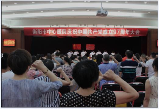 本網(wǎng)訊 通訊員唐冠群報道 為慶祝中國共產(chǎn)黨成立97周年,進(jìn)一步加強(qiáng)醫(yī)院黨支部及黨員隊(duì)伍建設(shè),激勵廣大黨員干部堅定理想信念,激發(fā)全院黨員“不忘初心、牢記使命”的責(zé)任擔(dān)當(dāng),形成最強(qiáng)執(zhí)行、凝心聚力、積極向上的濃厚氛圍,6月29日,衡陽市中心醫(yī)院慶祝中國共產(chǎn)黨建黨97周年大會在莊嚴(yán)的國歌聲中隆重開幕。全體院黨委委員、全體在職黨員、退休支部支委近300人參加了會議,院黨委書記肖友儒發(fā)表講話并講黨課,院長、黨委副書記申惠龍主持會議。