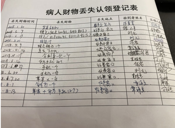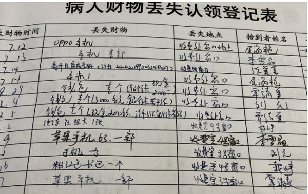 翻開(kāi)華新收費(fèi)處的《病人財(cái)物丟失認(rèn)領(lǐng)登記表》,密密麻麻記載了一年來(lái)門(mén)診收費(fèi)處的好人好事:劉元、覃靖美某年某月某日撿到錢(qián)包一個(gè),張美蓉何時(shí)何地拾獲手機(jī)一個(gè),戴崢哪天哪日撿獲錢(qián)包,銀行卡,醫(yī)保卡、蘋(píng)果手機(jī)、華為手機(jī)……不勝枚舉。