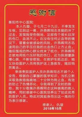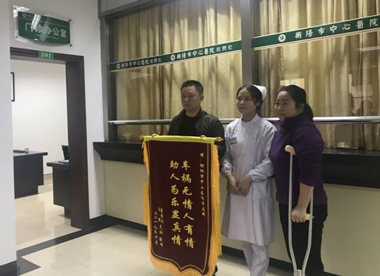 10月25日上午,當袁俊杰攙扶著柱著拐杖還未痊愈的妻子前來衡陽市中心醫(yī)院門診辦公室送上錦旗和感謝信,這件感人的好事也浮出了水面,許燕暉面對前來感謝的袁俊杰、仇璇夫妻時,表現(xiàn)出一名95后女生的羞澀,不好意思地表示“我是護士,救人就是我的職責(zé)!”。