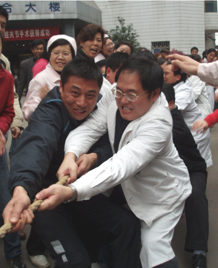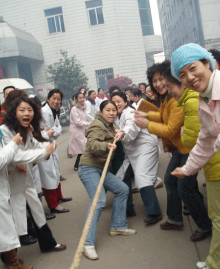 我院舉行撥河比賽(圖) 發(fā)布時間:2007年3月23日 預(yù)覽:4516次 3月21日下午,全院職工拔河比賽在外科大樓前坪舉行。12支代表隊參加比賽,分男女隊進行。比賽結(jié)果:門診醫(yī)技隊、機關(guān)隊、外科隊分獲男隊冠亞季軍,外科隊、門診醫(yī)技隊、機關(guān)隊分獲女隊冠亞季軍。(建軍)